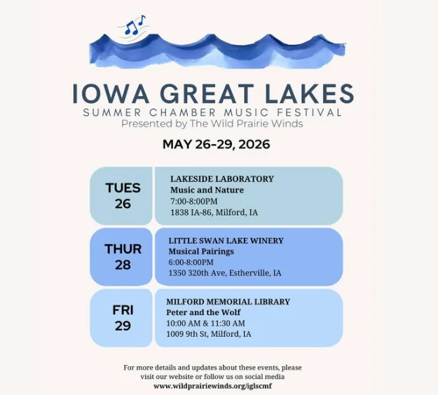 (Okoboji)--The Iowa Great Lakes Summer Chamber Festival will again be held at various locations around the area this summer. The music is performed by the Wild Prairie Winds Quintet. Katey Jahnke is a member of the quintet.