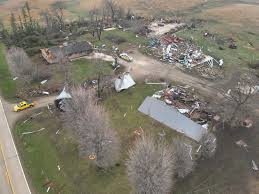 A photo from Palo Alto County Emergency Management shows multiple buildings blown apart and a house missing good chunks out of its roof. Debris is scattered on the property and many trees have been broken in pieces.